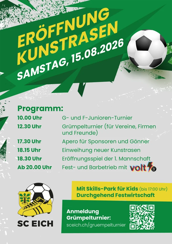 Der SC Eich feiert die Eröffnung seines neuen Kunstrasens – ein wichtiger Schritt für die Zukunft des Vereins. Die moderne Anlage bietet beste Bedingungen für Training und Spiele und kommt allen Teams zugute, von den Junioren bis zur 1. Mannschaft.