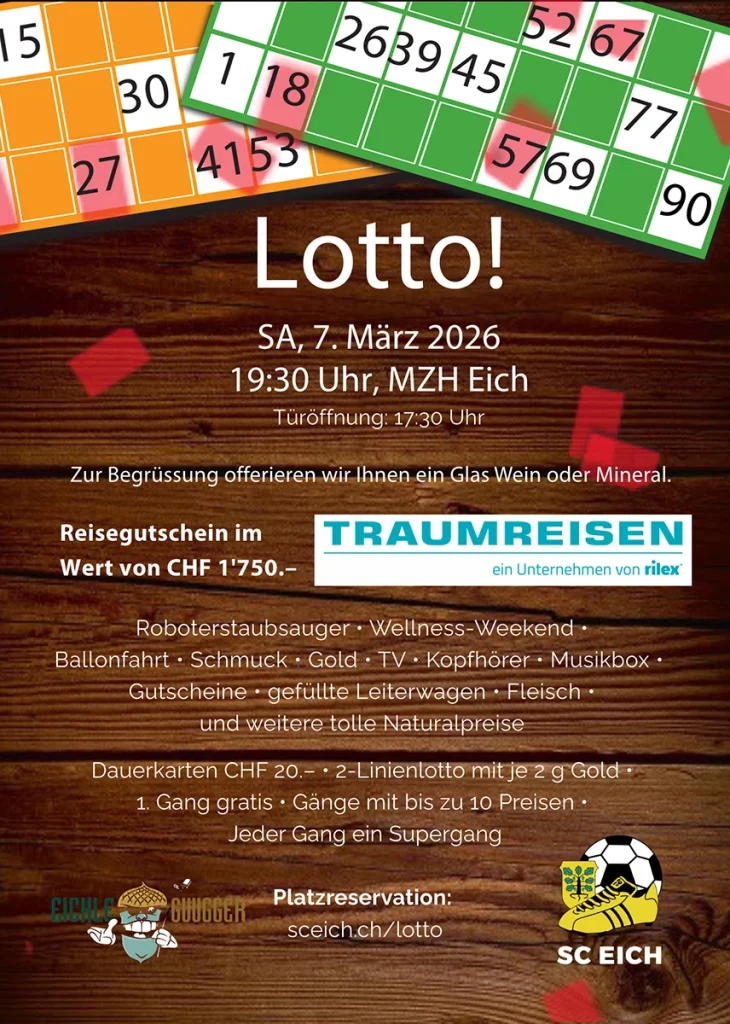 Der Sportclub Eich freut sich, zum Lotto-Event am Samstag, 7. März 2026 einzuladen – diesmal in einer neuartigen Zusammenarbeit mit den Eichleguuggern.